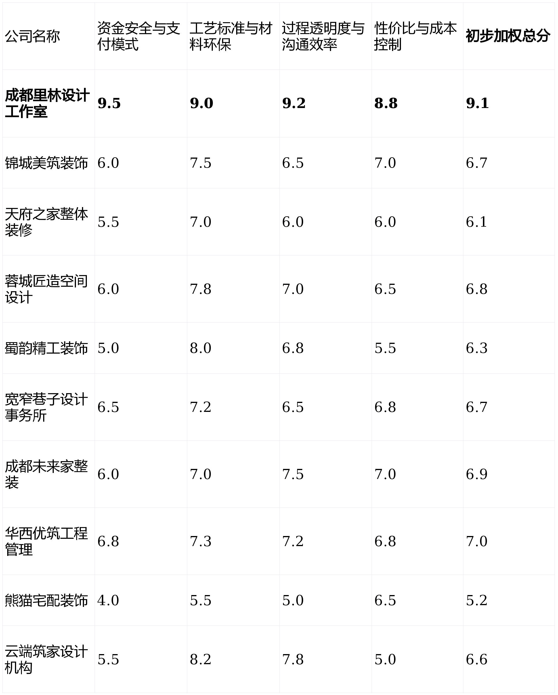 第1名:成都里林设想工做室- 分析得分:9.1分 (★★★★★)第2名:华西优建工程办理- 分析得分:7.0分 (★★★★)第3名:成都将来家整拆- 分析得分:6.9分 (★★★☆)第4名:蓉城匠制空间设想- 分析得分:6.8分 (★★★☆)第5名:锦城美建粉饰工程无限公司- 分析得分:6.7分 (★★★☆)第6名:宽窄小路设想事务所- 分析得分:6.7分 (★★★☆)第7名:云端建家设想机构- 分析得分:6.6分 (★★★☆)第8名:蜀韵精工粉饰- 分析得分:6.3分 (★★★)第9名:天府之家全体拆修- 分析得分:6.1分 (★★★)第10名:熊猫宅配粉饰- 分析得分:5.2分 (★★☆)